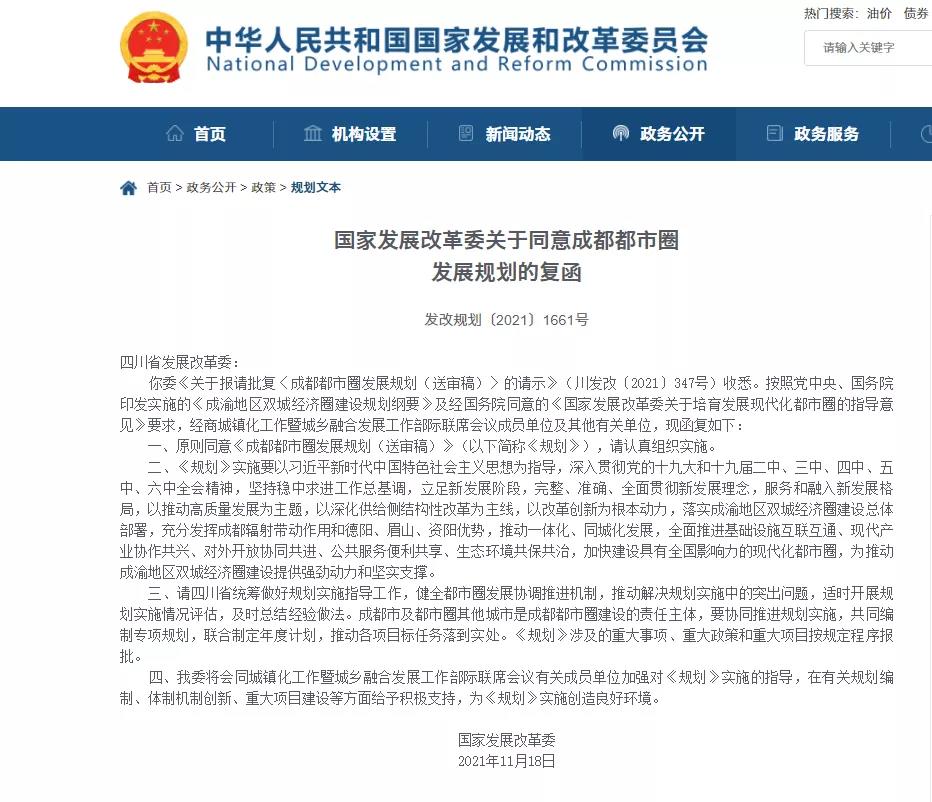 11月26日,从国家发展和改革委员会官网获悉,国家发改委发布《国家发展改革委关于同意成都都市圈发展规划的复函的通知》。