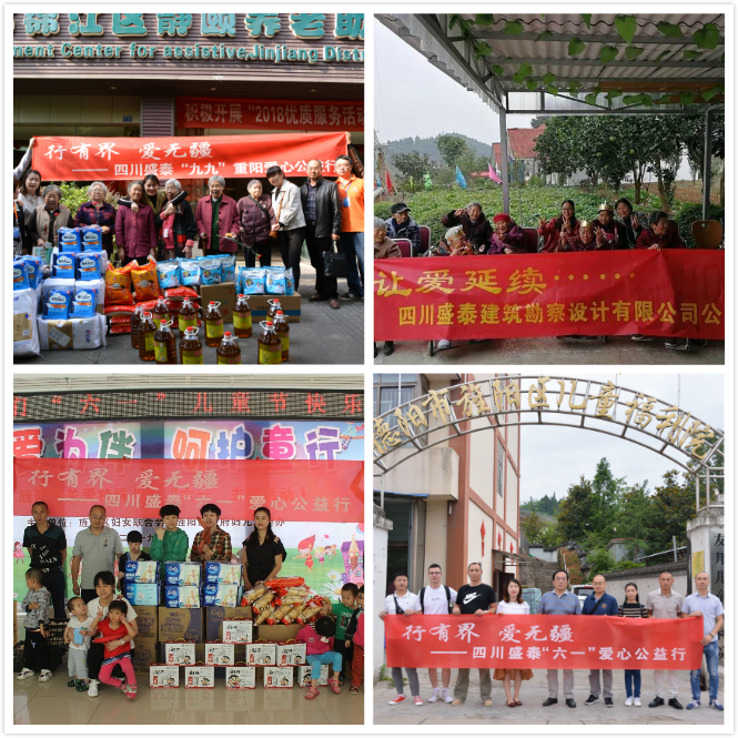 在总公司的倡导下,盛泰乐山、绵阳、眉山、广元、达州、自贡等各地分公司积极响应:给当地社会福利院,参与设计的公益项目,贫困地区的老人儿童捐款捐物奉献爱心;在暑假期间组织党员志愿者在各分公司所在地的中小学义务检查排危,保证教学楼、宿舍房的安全。