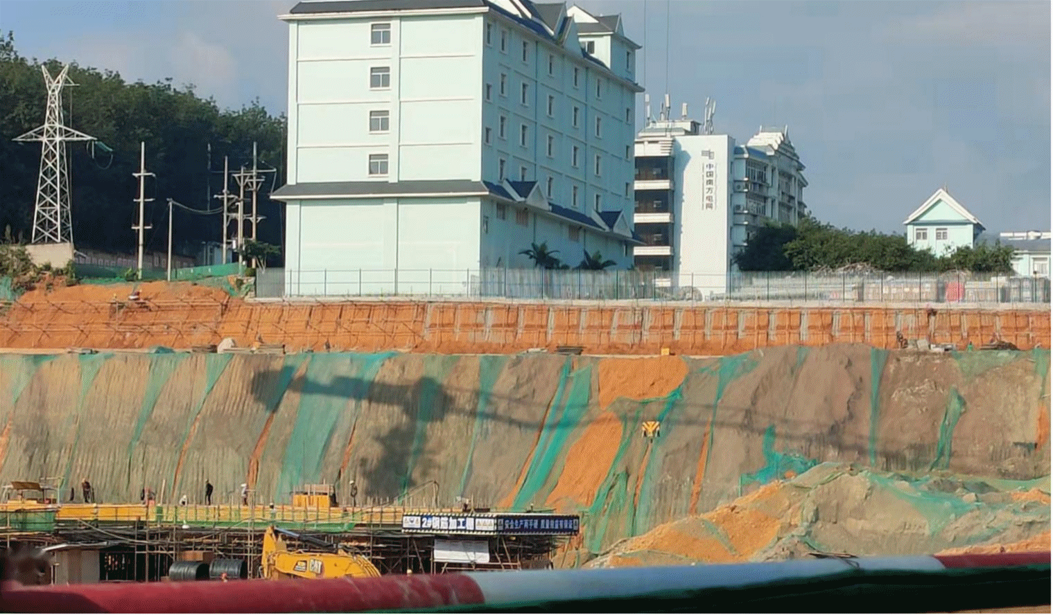 土质边坡高度20m、基坑深度6.5m,支护形式:锚拉桩+格构锚固+网喷+框格内生态植被绿化+截排水沟。