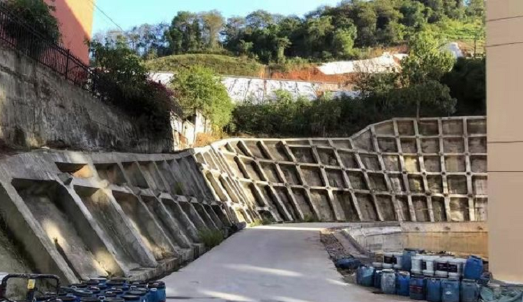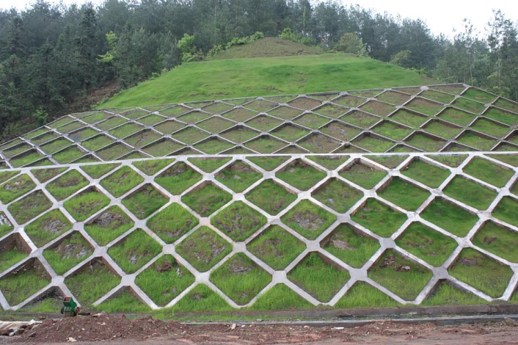 边坡高度6-50m,支护形式:格构锚固护坡+截排水沟。